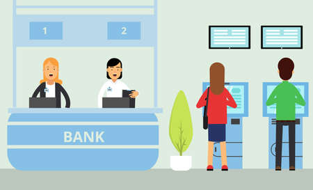 banking visitors and workers financial consulting center with waiting room reception and atm modern bank office interior horizontal banner flat vector illustration