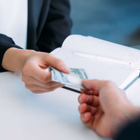 Cash money. Business corruption. Dollar bills bribe in man and woman hands.