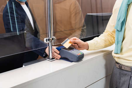 Cropped view of man paying with credit card near manager with payment terminal in hotel