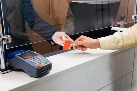 Cropped view of receptionist giving key to man near payment terminal in hotel lobby