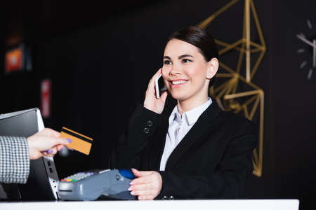 happy receptionist smiling and talking on smartphone near guest with credit card
