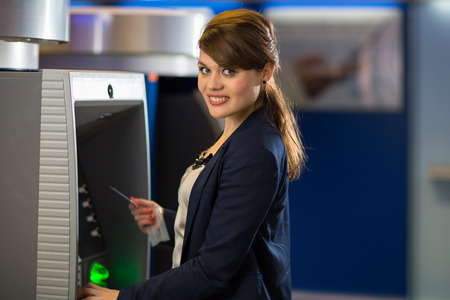 Pretty, young woman withdrawing money from her credit card in at an ATM (shallow DOF; color toned image)