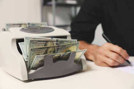 Us dollar banknotes in currency counter machine. Bank automated equipment for counting money. Exchange currency in bank office. Close up of paper money calculation, business concept