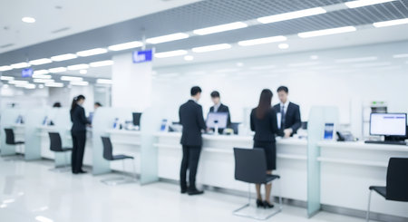 Blurred view of a bank interior. Customers and staff are at the counters. The scene is bright and white, with a modern aesthetic.