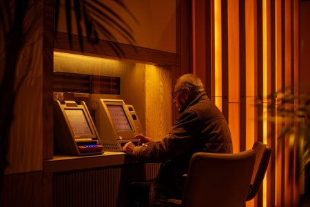 In a cozy, well-lit banking area, an elderly man interacts with an ATM, surrounded by soft lighting and stylish decor, immersed in his banking task during a quiet moment.
