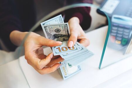 Woman giving money to cashier in bank, closeup. Currency exchange