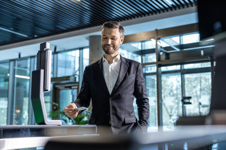 A cheerful individual is smiling and withdrawing cash from an atm machine in a secure and welcoming banking environment, enjoying the convenience and safety.