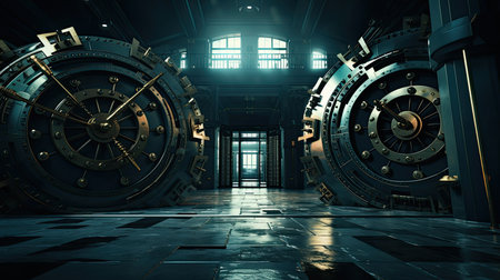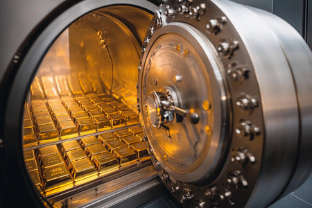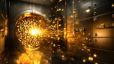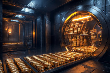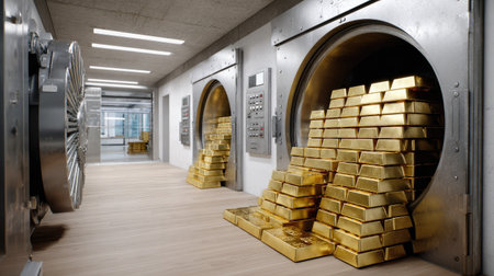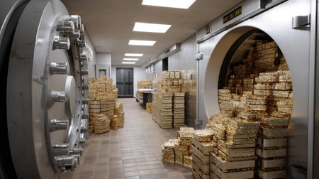 A captivating view of a bank vault filled with gleaming stacks of gold bars, set against a backdrop of robust security doors and industrial design.