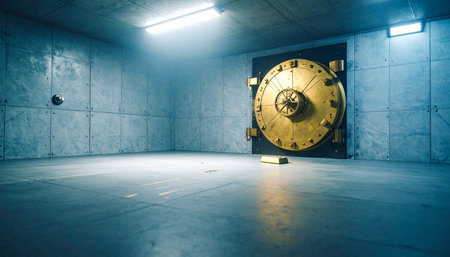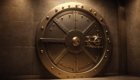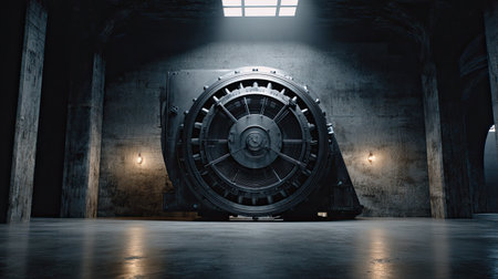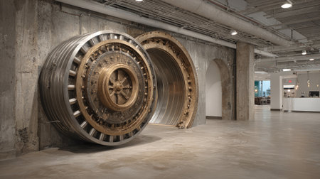 A striking image of a secure bank vault door set against a minimalist concrete chamber. The dramatic lighting emphasizes the industrial design. This image captures themes of security and wealth.