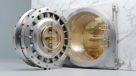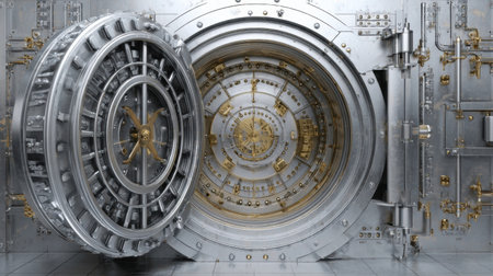 A large silver vault door stands open, showing detailed craftsmanship with golden accents and intricate mechanisms, set against a metallic backdrop.
