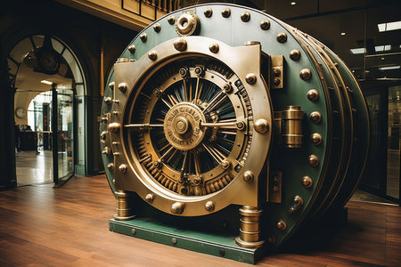 A detailed view of a vintage bank vault door showcases the craftsmanship of metalwork and an impressive locking mechanism, highlighting architectural elegance from a bygone era.