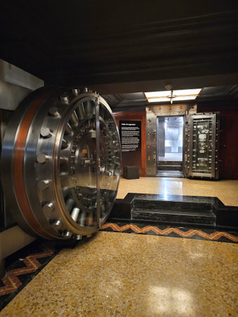 Mexico City, Mexico - Jul 12 2024: Banco de Mexico Museum in the main building of CDMX with the numismatic collection and entering the huge vault
