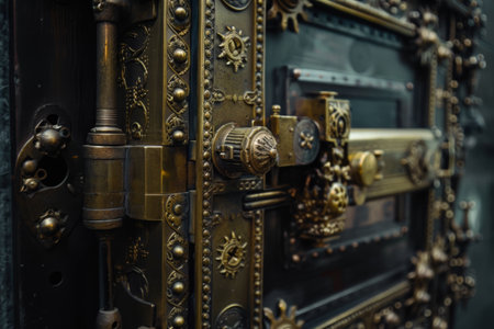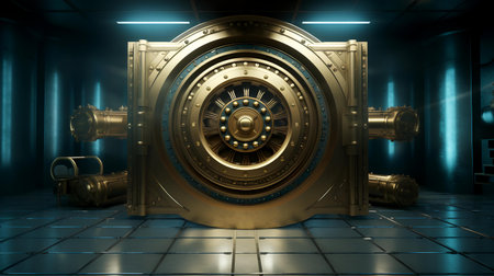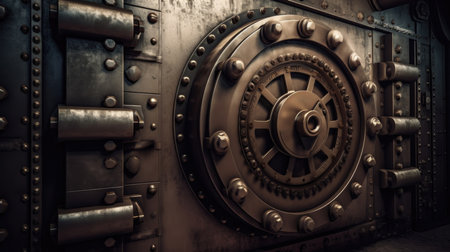 Behind this massive, intricately designed steampunk vault door lies a world of untold wealth and secrets. The warm, golden light illuminates the complex locking mechanism, hinting at the valuable treasures and opportunities protected within its impenetrable fortress.