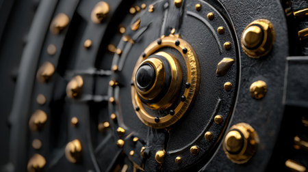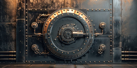 An old vintage bank vault safe door that creates a nice industrial steampunk background. This image is a metaphor for money, security, finance, and banking. Perfect for use in design projects related to finance, banking, or security.