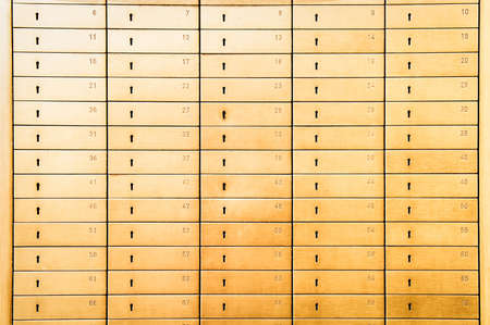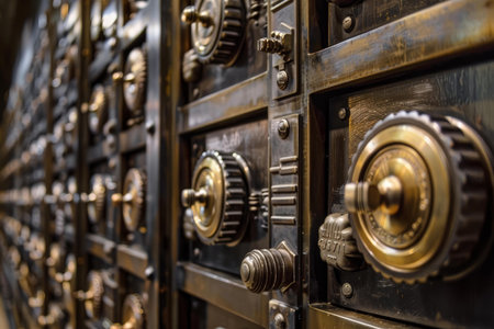 Rows of vintage safe deposit boxes with combination locks made of aged brass are lining a wall in a secure bank vault