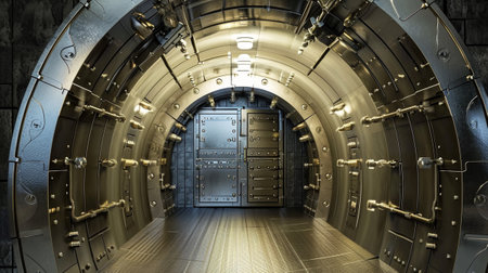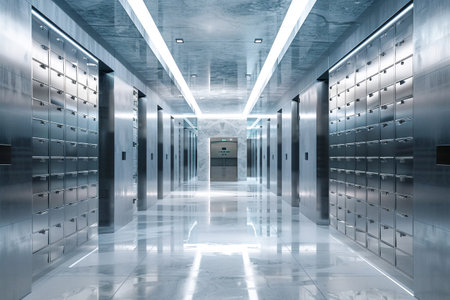 Rows of shiny safe deposit boxes are standing inside a bank vault, protecting valuables