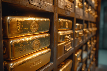 A row of gold bars neatly arranged in a vault, with soft lighting highlighting their metallic luster, symbolizing financial security and stored wealth.