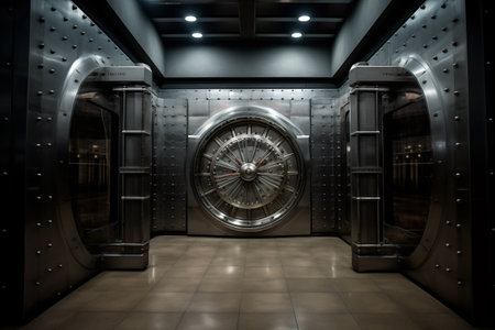 Steel-reinforced walls of the bank vault, showcasing its strength and durability. Round door for storage bank stuff. Generative AI