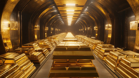 This image showcases a secure vault interior filled with gleaming gold bars stacked high, emphasizing a world of wealth and security in modern finance.