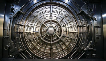 A round vault door in a bank, showing its complex design. The door is made of heavy metal with complex locking mechanisms visible.