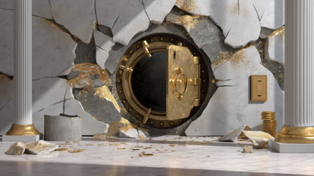 An intriguing image of a cracked wall revealing an open vault door, surrounded by gold coins and broken concrete, capturing themes of wealth, mystery, and architectural decay.