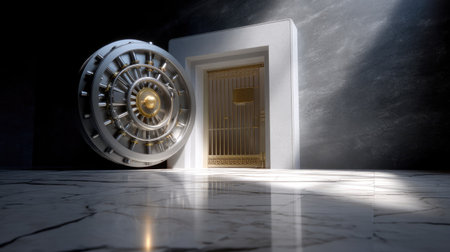 This image features a vintage bank vault door ajar, revealing an elegant marble floor illuminated by soft light, conveying a sense of luxury and security.