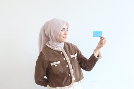 A young woman in a brown corduroy jacket and beige hijab holds a light blue card. She looks at the card thoughtfully.