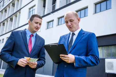 Two young businessmen give and take dollar banknote .Investment and payment concept.