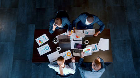 Business people group meeting shot from top view in office . Profession businesswomen, businessmen and office workers working in team conference with project planning document on meeting table .