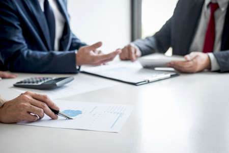 Group of partner working conversation, Business team meeting present with investor colleagues discussing plan financial graph data and analyzing strategy to growth up to profit into company.