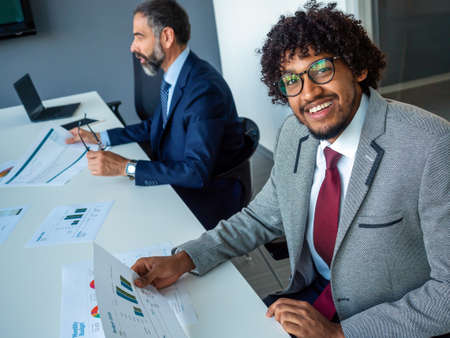 business results discussion. report documents review. professional coworkers read financial papers with diagrams and graphs. corporate men focused on statistics data