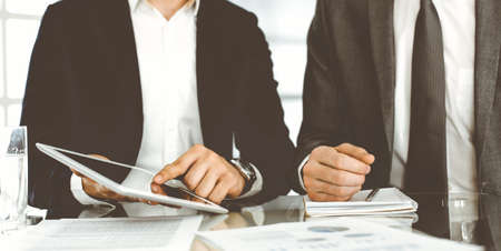Business people using tablet computer while working together in modern office. Unknown businessman sitting at the desk with his colleague or partner. Teamwork and partnership concept