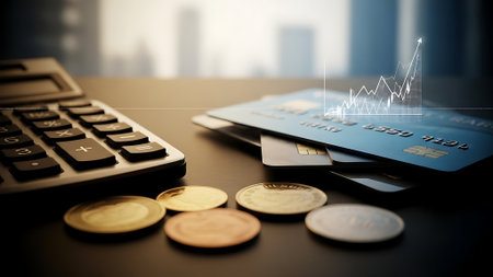 On table american dollars plastic cards and calculator and magnifying glass. Financial Empowerment Concept