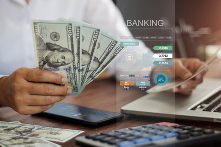 Banking and finance accounting, Businessman holding banknote and analyzing data growth graph on mobile and laptop and using calculator to calculate the numbers currency exchange.
