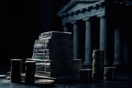 This visually striking image captures the essence of modern finance, showcasing digital currency, money, and a contemporary bank structure in a global context.