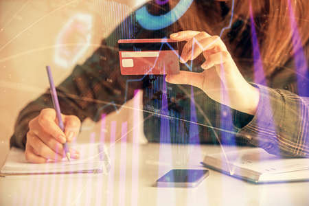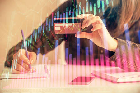 Double exposure of woman on-line shopping holding a credit card and financial graph drawing. Stock market E-commerce concept.