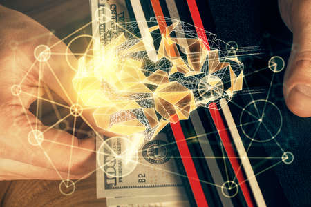 Multi exposure of brain drawing hologram and us dollars bills and man hands. Ai invest concept