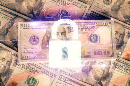 Double exposure of lock drawing over us dollars bill background. Security safe concept.