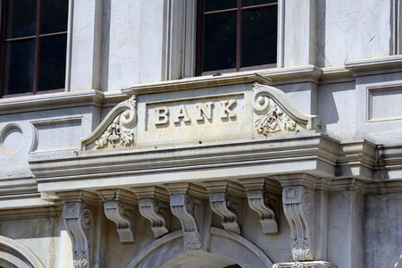 Bank Stone Sign. Retro styled image of an old bank sign carved in a concrete wall. Street view, nobody, selective focus, travel photo