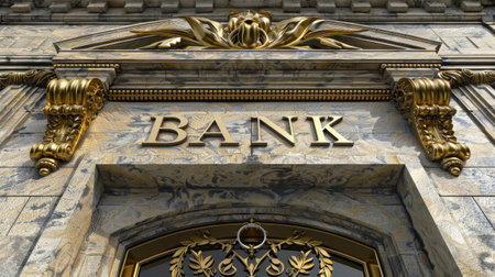 A historic bank building facade features a prominent 'BANK' sign above an open doorway. Stone architecture and grand steps lead to the entrance, conveying tradition and financial services.