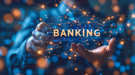 Businessman with a holding With a network link to AI banking and finance, a customer network, digital marketing, fintech, finance company, and technology, write the word BANKING in hand. online safety.