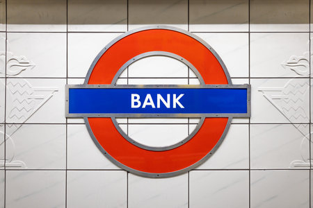 London, United Kingdom - February 01, 2019: Underground BANK station sign at wall of central line tube station