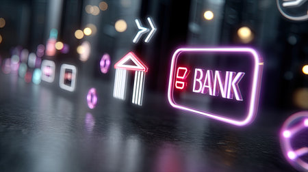This captivating neon illuminated bank sign shines brightly against a modern city skyline at night, showcasing a blend of technology and urban ambiance.