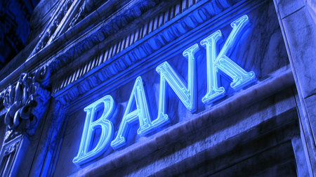 Blue Neon Bank Sign on a Classic Building Facade, Finance, Banking, and Urban Concept