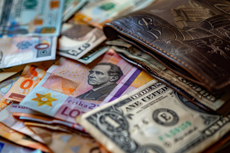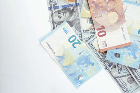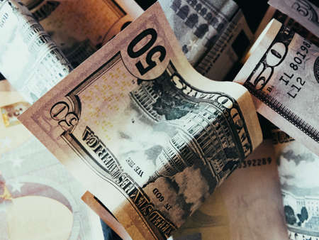 Cash banknotes dollars and euros are mixed up, a close-up shot.
