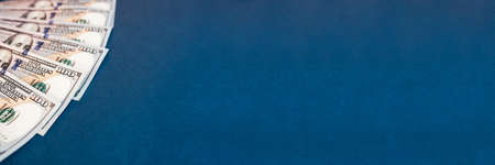 American cash dollars. One Hundred Dollar Banknotes on blue background. Copy space.