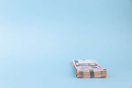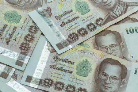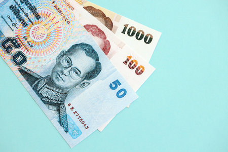 Thai baht money bills in big amount on blue close up. Finance and banking concept