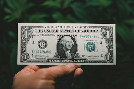 Dollar usa bill on cannabis leaves. Taxation and marijuana. The economy of marijuana industry. Tax on dispenser. Money and cannabis. Pot finance. Revenues in the marijuana industry and the medical.