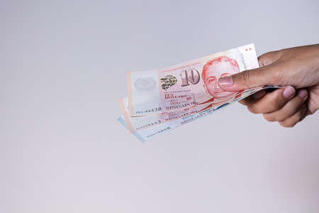 Singapore dollars in female hand. Woman's hands show Singaporean dollar banknotes. Girls hands holding money of Singapore. Asian currency. Close up on fifty Singapore Dollars notes