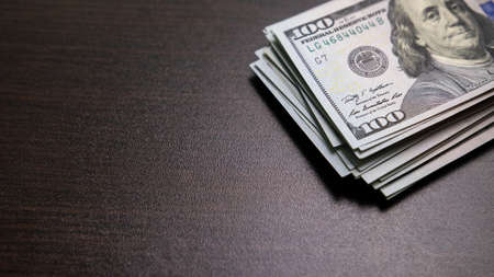 Stack of hundred-dollar bills on wooden surface of desk. Space for text. Concept of welfare and investment. Stop motion shooting